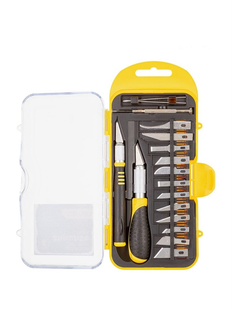 Набор — универсально подходит для работы в любой обстановке. Включает 2 ножа с удобными ручками, 14 сменных лезвий, пинцет и отвертку, что делает его подходящим для огромного списка задач.