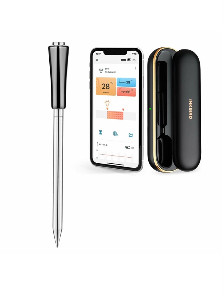 С помощью этого термометра для духовки вы сможете контролировать температуру ваших блюд в реальном времени. Благодаря беспроводной технологии, которую использует этот термометр кулинарный с щупом, вы можете быть уверены, что ваше мясо, птица или рыба будут приготовлены идеально - он точно и заранее предупредит вас что блюдо готово. Датчик представляет собой термощуп, который передает показания по беспроводной технологии Bluetooth - он просто не имеет аналогов для приготовления пищи на вертеле!